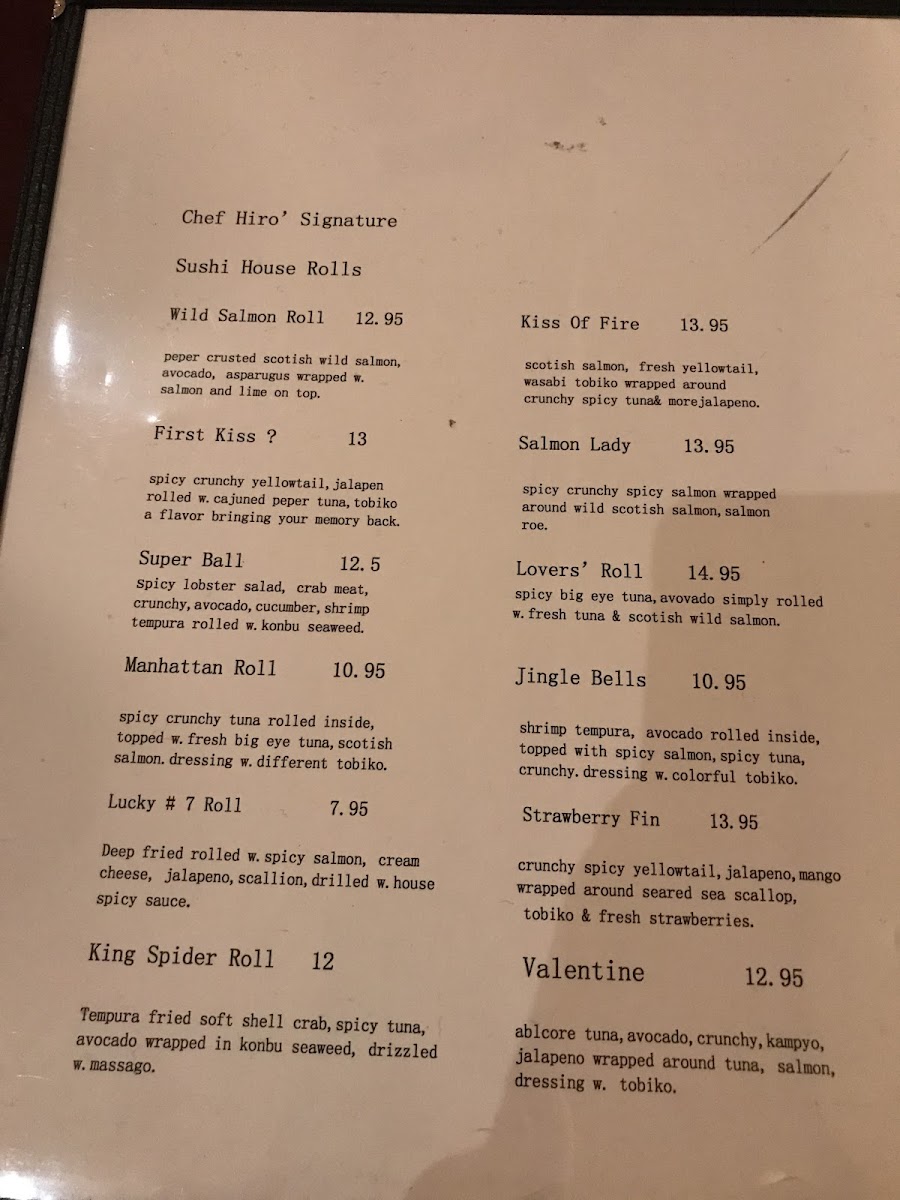 California roll, Philly roll, spicy crab roll, spicy tuna roll, spicy salmon roll , shrimp tempura roll, and special roll of pink lady roll, cherry blossom roll , wcu roll .